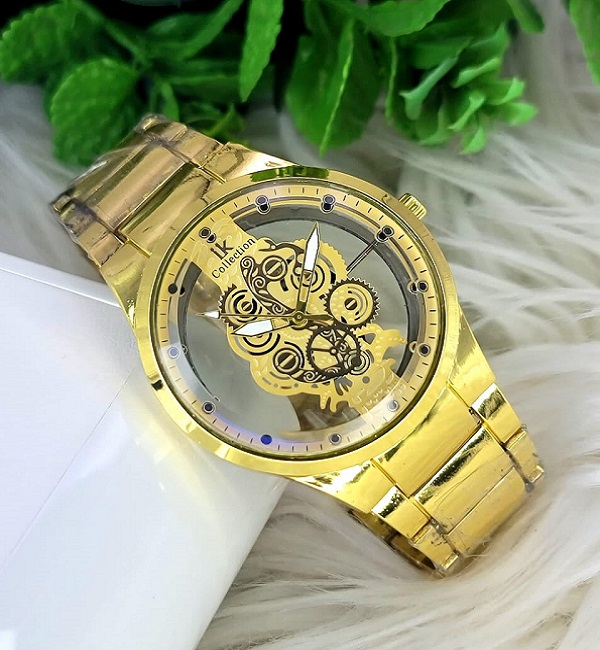 The watch is encased in a polished gold-tone frame and paired with a high-quality metallic link strap that provides a substantial, premium feel on the wrist. Designed for the bold and the stylish, this unisex watch serves as a brilliant conversation starter at weddings, business meetings, or formal parties. Its brilliant gold finish is engineered to resist fading, ensuring that your timepiece remains a shining staple of your collection. Get the best gold skeleton watch price in Pakistan and showcase your unique sense of style.